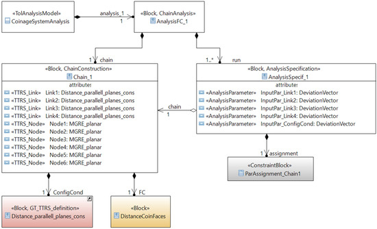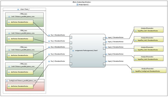 The Chain Analysis also includes at least one Analysis Specification, where the input Parameters (DeviationVector usages and FC_Requirement) for the analysis are established. The analysis requires as many DeviationVectors as nodes included in the chain, relating nodes’ properties and vectors through a ConstraintBlock that establish this assignment. Resulting from the Chain Analysis, the value for the Functional Condition is obtained (FC_Value). Finally, the FC_Compliance ConstraintBlock establishes the equations for the comparison between FC_Value and FC_Requirement.