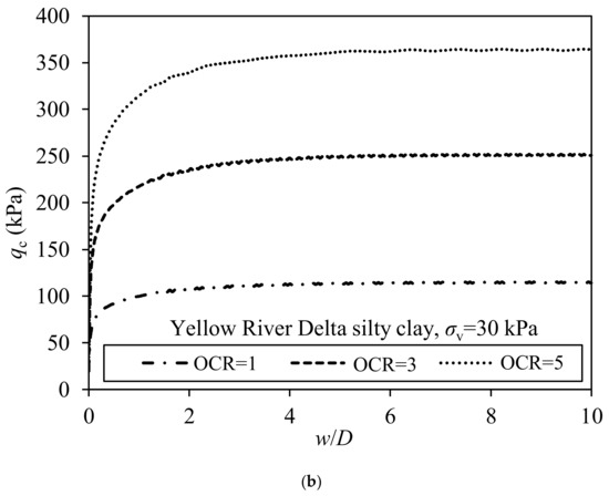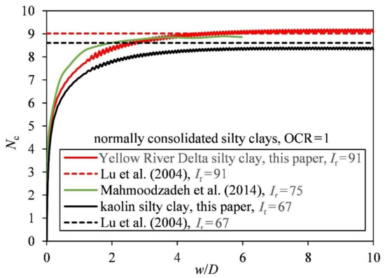 The cone resistance factor Nc is shown in Figure 4. It shows that the OCR almost does not affect Nc. The reason is that Nc mainly depends on plastic zone size and Ir is outside the plastic zone. The cone resistance factor Nc tends to be stable between 8–8.9 in kaolin silty clays and 8.9–9.9 in Yellow River Delta silty clay.