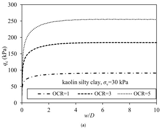 The cone tip resistance qc under different OCRs is shown in Figure 3. According to Figure 3, the OCR had a significant influence on qc.