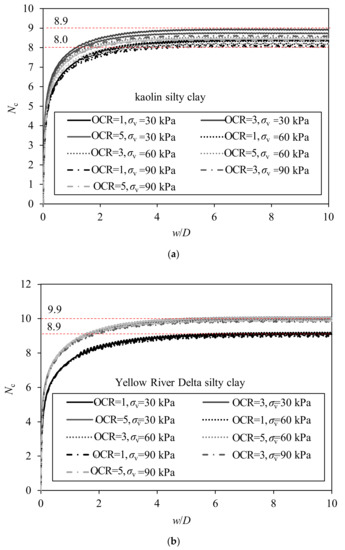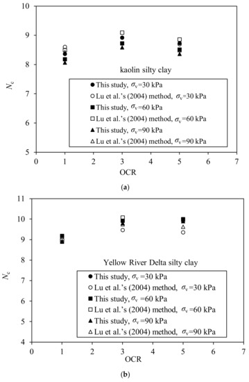 Nc under different OCR and σv conditions. (a) Kaolin silty clay; (b) Yellow River delta silty clay [6].