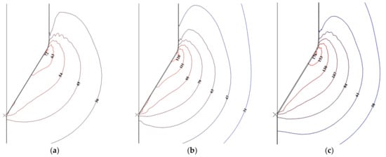 Computed Δu contours after penetration under different OCR at σv = 30 kPa in kaolin silty clays. (a) OCR = 1; (b) OCR = 3; (c) OCR = 5.