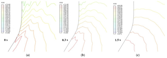 Δu contours after dissipation for 0 s, 0.3 s and 1.5 s in kaolin silty clays. (a) t = 0 s; (b) t = 0.3 s; (c) t = 1.5 s.