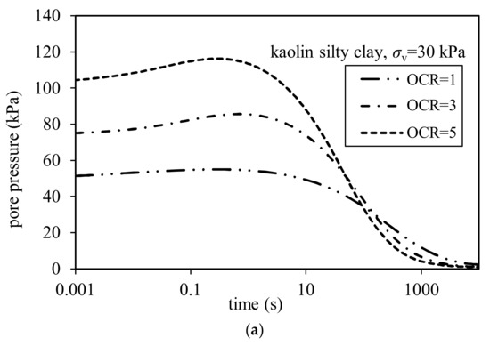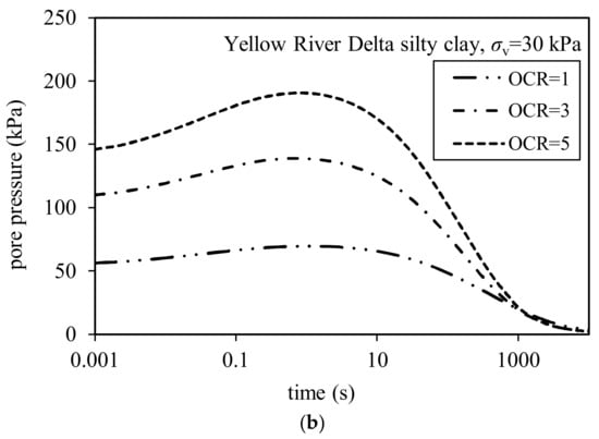 The computed excess pore pressure Δu contours after penetration and before dissipation for different OCRs at σv = 30 kPa in kaolin silty clays are shown in Figure 6. The excess pore pressure Δu contours of the Yellow River Delta silty clay was almost the same. The size of the pore pressure influence zone changed little. However, the gradient of the pore pressure increased with the increase in OCR. The pore pressure along the radial direction at the cone shoulder (u2) increased before it decreased. As the OCR increased, the changes became more dramatic.