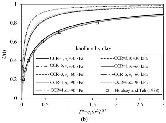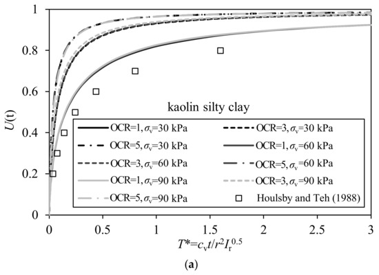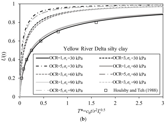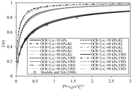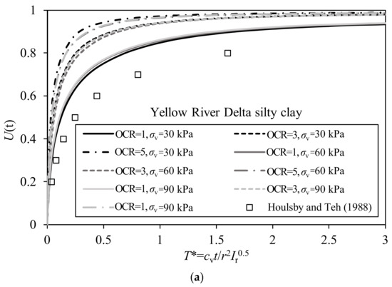 The pore pressure dissipation curve with OCR = 1, 3 and 5 at σv = 30 kPa is shown in Figure 8. It shows that a higher OCR leads to a faster normalized dissipation response, and the same trend was observed at σv = 60 kPa and σv = 90 kPa. Houlsby and Teh [20] suggested the use of T* instead of T and gave the corresponding T* for the cone shoulder position under different consolidation degrees. The consolidation degree and T* are defined as:
