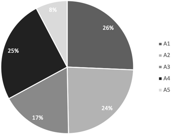 Figure 2 presents the relative importance of the sustainability areas and shows that according to the professionals’ opinion, the Environmental (A1), Sociocultural and Functional (A2), and Technical (A4) areas have similar relative importance. Subsequently, the Economy (A3) area’s importance was 17%, and Site (A5) was appointed as the least relevant, corresponding to a weight of 8%.
