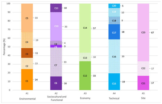 Finally, the weight of each category within the areas is presented in Figure 3. The category with the most significant impact on an area was C23 (Conveniences), representing 67% of the A5 (Site) total. Nevertheless, the importance of the Site area in the overall sustainability level is only 8%. The categories with the lower influence were C8 (Landscaping) and C9 (Passive design), which belong to the “Sociocultural and functional” area, having weights of 3% and 4%, respectively.