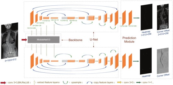 The network structure for detecting vertebral center points consists of three parts, with a lightweight network MobileNetV3 [19] as the Backbone for feature extraction. This Backbone network can generate five feature layers with different resolutions and a different number of convolution kernels which contain the information on different scales of the input X-ray image.