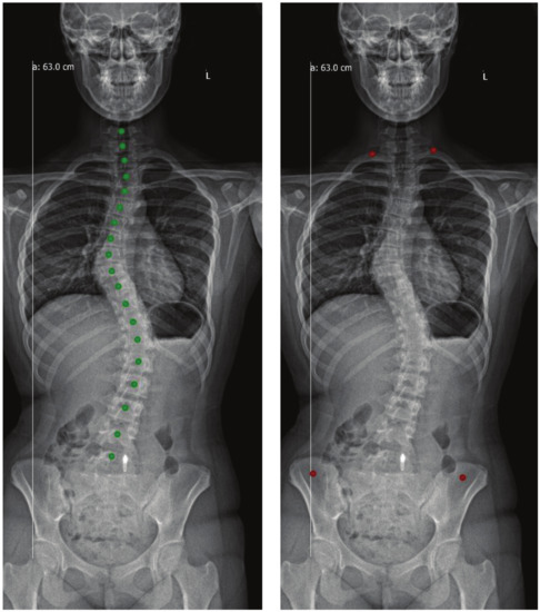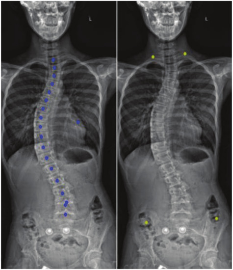 - Sun, Y.; Xing, Y.Z.; Zhao, Z.; Meng, X.; Xu, G.; Hai, Y. Comparison of manual versus automated measurement of Cobb angle in idiopathic scoliosis based on a deep learning keypoint detection technology. Eur. Spine J. 2022, 31, 1969–1978. [Google Scholar] [CrossRef] [PubMed]