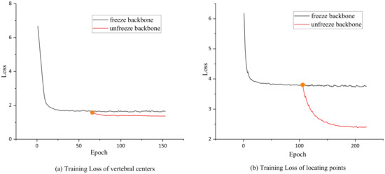 The Backbone weights are initially frozen while the feature layer weights of the network are trained. When the loss stops decreasing, the Backbone weights are unfrozen, and the entire network is trained until the model converges. The two parallel routes are trained to obtain two sets of weights, employed to predict the vertebral center points and the four anchor points, respectively. The Adam optimizer [26] was adopted during training, and the learning rate decays exponentially. Figure 4 shows the changes in the loss of vertebral center points and anchor points before and after freezing the Backbone weights during training. As can be seen in the figure, the loss further decreased when the backbone was unfrozen during training.