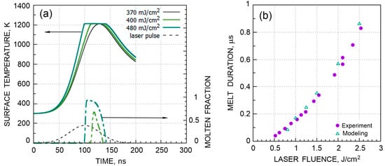 The next set of simulations has been carried out for germanium for the conditions of the experiments reported in [10]: wavelength 694 nm and pulse duration 70 ns. Time-resolved reflectivity measurements using a probe 1.06 μm laser wavelength identified the energy density of 400 mJ/cm2 as a value, at which the rise of reflectivity was detected corresponding to the observable melting. Numerical simulations using the finite difference method were also carried out in Ref. [10], and the obtained melting threshold was claimed to be “practically identical” to the measured one (although the method for threshold determination in the simulation was not specified). The authors used experimentally measured values of reflectivity and absorption from Refs. [9,47], which are in good agreement with the optical constants we derived from measurements reported in [48] and also confirmed in [49]. Our calculations give Fth = 370 mJ/cm2 (Figure 1a, Table 1), which is in good agreement with the data [10], particularly taking into account that the increase in reflectivity detected in [10] assumes a significant fraction of molten germanium and thus a slightly higher fluence than that needed to reach the melting temperature at the surface. Near the melting threshold, the calculated melt fraction reaches a maximum after a delay of approximately 20 ns relative to the moment of laser peak intensity (Figure 1a), which is also in agreement with the measurements [10]. With the known properties of liquid Ge (Table A7 and Table A8), we have performed simulations for F > Fth, which are again in good agreement with the measured durations of a high reflectivity stage corresponding to molten germanium [10] (Figure 1b). It should be mentioned that different values are reported for the thermal conductivity of liquid Ge. In the modeling, we use the value of 29.7 W/(m·K) [50], while in Ref. [51], κ = 43 W/(m·K) was measured. The calculations performed for various pulse durations demonstrate a stronger τL dependence than that for silicon, close to the ∝ τL0.5 dependence (Table 1).