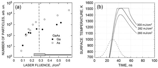 λ = 694 nm, τ = 20 ns. Pospieszczyk et al. [13] presented two sets of measurements. Using a HeNe probe laser, the temperature-dependent reflectivity was investigated. The second set of data gives time-of-flight measurements of particles evaporated from the GaAs surface (Figure 3a). Comparison of their experimental data and our simulations is given in Table 1, which are in reasonable agreement. The simulated damage threshold associated with achieving the melting temperature (Figure 3b) is somewhat higher than in the experiments [13] but is still in the range of fluences where a transient uneven melting is observed (Figure 3). This discrepancy, although relatively small, can be related to the effect of decreasing the melting temperature due to depletion of the target surface by a more volatile component [30,31,56], which is not taken into account in our model.