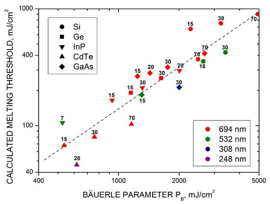 Figure 4 shows the calculated melting threshold values plotted as a function of the PB parameter, Equation (8), evaluated for all the studied materials using their room-temperature properties. All the data are nicely grouped around a straight line in the logarithmic plot. This clear correlation is rather surprising for such a simplified generalization approach when the material absorption coefficient and temperature dependencies of thermophysical properties are not taken into account. The least square fitting line in Figure 4 is described by a power law, Fth ≈ 0.05 PB1.16, which can be used for a rough estimation of the melting threshold of semiconductors based on their basic room-temperature properties.