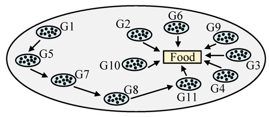 The basic idea of the SFLA algorithm is that there are N frogs living in a wetland, and they find the place with the most food by jumping over different rocks. Each frog is defined as a feasible solution, and N frogs are divided into different subgroups according to specific rules. Each frog has its own decision information, and it evolves from the subgroups by communicating with each other, and the subgroups evolve accordingly (local search). After the evolution to a certain extent, the information about the subgroups is exchanged until the algorithm meets the convergence condition (global search). A schematic diagram of the SFLA algorithm is shown in Figure 2.