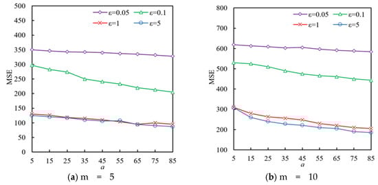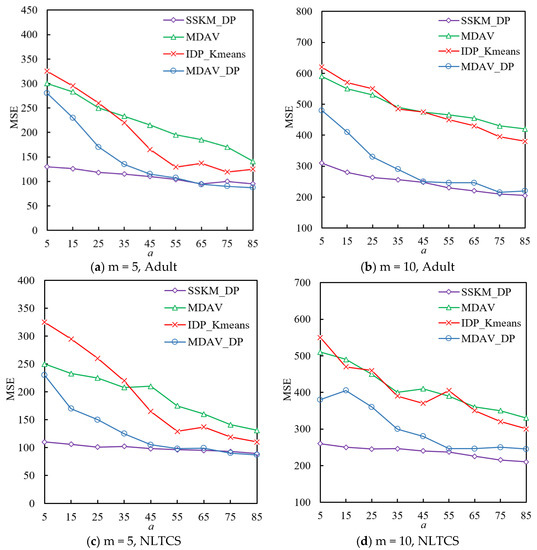 As can be seen from Figure 7, for Adult and NLTCS data, when was 1 and the number of attributes m was 5 and 10, respectively, the MSE of MDAV, IDP_KMENAS, and MDAV_DP gradually decreased with the increase of the number of clustering a, while the MSE of the SSKM_DP algorithm remained stable all the time. The MSE of SSKM_DP was always smaller than the MSE of the other three algorithms. This is because MDAV, IDP_KMENAS, and MDAV_DP are very sensitive to the number of clustering a, resulting in uneven clustering results and considerable information loss, while SSKM_DP is not affected by the number of clustering a and has a good anti-noise ability.