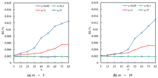 As can be seen from Figure 6, for the Adult data, when the value of ɛ was {0.05, 0.1}, even if the value of attribute number m and cluster number a changed, the value of the record correlation RL did not change significantly. When the value of ɛ was 5, the value of RL also increased with the increase of a, the risk of information disclosure gradually increased, and the ability of privacy protection decreased. As can be seen from Figure 4 and Figure 5, when the privacy budget was 1 and 5, the SSKM_DP algorithm had good data utility. When ɛ was 1, the privacy protection ability of SSKM_DP algorithm was much better than that of as 5. Therefore, this paper took = 1 as the optimal privacy budget value of the SSKM_DP algorithm.