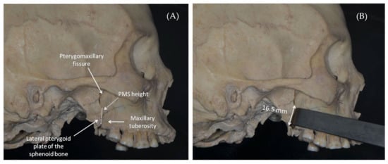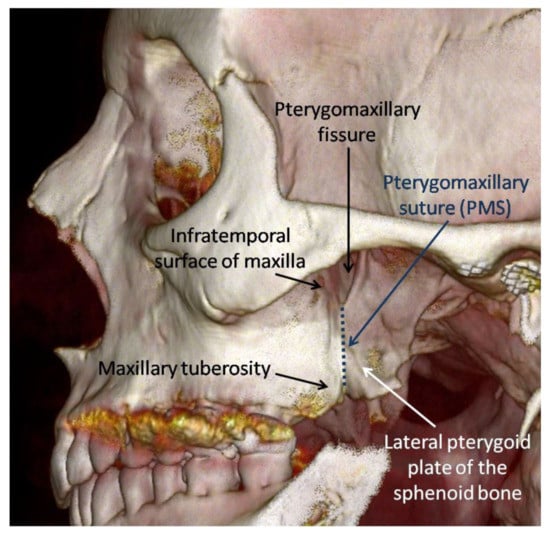The method for correcting dentofacial deformations of the midface involves Le Fort I maxillary osteotomy, during which a controlled fracture to separate the maxilla from the base of skull is carried out. The pterygomaxillary suture (PMS) is one of the synostoses that must be separated during this surgical procedure. This suture is a complex three-dimensional structure that connects the maxilla and the pterygoid plates of the sphenoid bone; it can be characterized by its thickness, height [1,2,3], and the angle created by the connection of the bones relative to the midsagittal plane of skull. The inferior part of the suture begins at the connection between the maxillary tuberosity and the pterygoid plate, and its superior part creates the base of the pterygomaxillary fissure (Figure 1).
