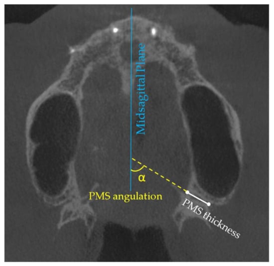 The data were stored in the Digital Image Communications in Medicine (DICOM) templates. The thickness of the slice used was 1 mm. The measurements were performed using Randi Ant Dicom Viewer software version 5.5 (Medixant, Poznan, Poland). The measurements were taken directly from the CBCT scans and included one angular and two linear parameters that characterize PMS morphology. All of the measurements were established on the axial sections of the maxilla separately for the right and left side of the patient. These measurements included the following: