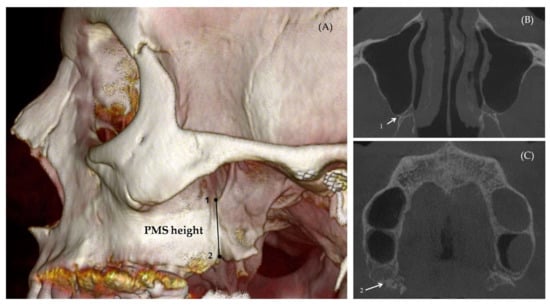 Figure 4. The method for measuring the PMS height. (A) A volume rendering of the lateral view of the skull representing the PMS height defined by the most superior point (landmark number 1) and the most inferior point (landmark number 2). (B) A CBCT section that represents the superior most point (landmark number 1) on the PMS height measurement, where the PMS is seen just before it opens into a pterygomaxillary fissure (the white arrow). (C) A CBCT section that represents the inferior most point (landmark number 2) on the PMS height measurement, where the maxillary tuberosity and the pterygoid hamulus are seen (the white arrow).