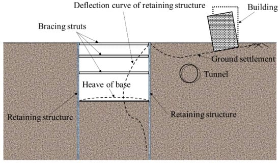 With the ongoing development of urbanization in China, the high-rise and super-high-rise buildings and the infrastructure such as roads, subways, and utility tunnels spring up continuously in major cities, which make the effective space of urban construction smaller and the construction environment more complex. The existing infrastructure and buildings are inevitably affected by adjacent excavation. Therefore, the safety of the surrounding environment during excavation has become a focus of attention, and much fruitful research on the hot issues of underground excavation and its induced site deformation in infrastructure construction has been published [1,2,3,4,5,6,7,8,9,10,11,12,13,14]. Meanwhile, the safety of existing buildings and utilities close to excavation is receiving more and more attention [15,16,17,18,19,20,21,22,23,24,25,26,27,28].