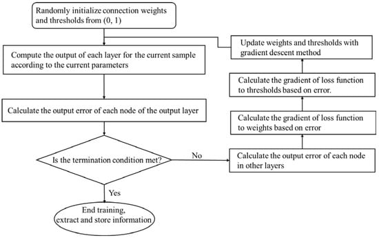 ANNs composed of an input layer, hidden layer, and output layer represent a black-box data-driven method enabling non-linear mapping between input variable sets and output variable sets without considering their physical interpretation. Of the ANNs, the BP neural network (as shown in Figure 3) is a feed-forward multilayer perceptron model using an error back-propagation learning algorithm, which has the characteristics of simplicity and high accuracy. The mapping function between adjacent layers is formed by adjusting the weight, and the nonlinearity is realized by selecting the activation function. The error back-propagation learning algorithm realizes the back-propagation of the learning method based on the error back-propagation. Figure 4 illustrates the workflow of the BP neural network algorithm. Through continuous learning with training samples, it continuously adjusts the threshold and connection weight between different layers, and finally realizes the transfer from input layer neurons to the output layer and produces the results.