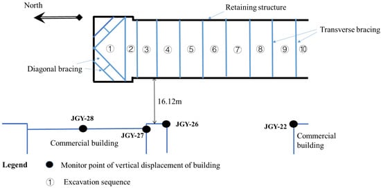 Figure 7 shows the relative position of the commercial building and the excavation. The monitoring items include the vertical displacement of the building, the ground vertical displacement, the deflection of the retaining structure, the vertical displacement at the top of the retaining structure, the horizontal displacement at the top of the retaining structure, the axial force of bracing, the vertical displacement of the column, and the groundwater table. The foundation pit is excavated from north to south, as indicated by the serial numbers of ① to ⑩ in Figure 7.