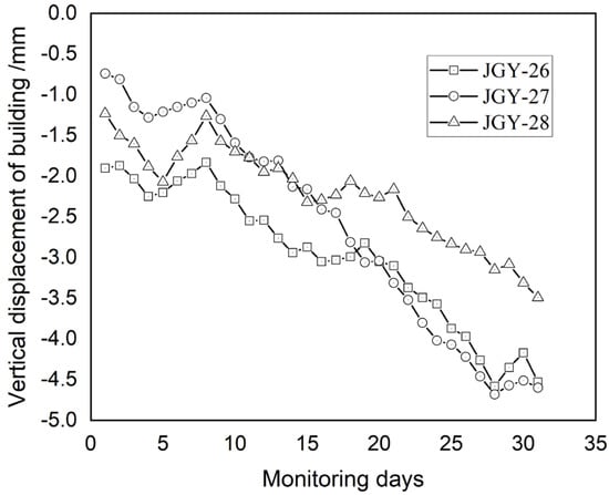 The responses of existing buildings are an issue of great concern in excavation. In this study, the settlement of existing buildings adjacent to excavation is selected as the research object, i.e., the output variable. In order to better predict this, the maximum envelope principle is used to deal with the on-site monitoring results—that is, the maximum cumulative settlement of the measuring points in the current period is taken as the equivalent settlement of the surrounding buildings.