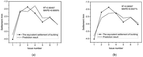 The LIBSVM toolbox with the RBF kernel function is employed in this study. From the original sample data, 24 groups of sample data are randomly selected as training samples to form training sets, and the remaining 7 groups of sample data are taken as testing samples to form testing sets. Based on the data of the training sets, the parameter of the error penalty factor (c) and the kernel function parameter (γ) are optimized using a cross-validation technique and grid-search method under the tolerance of a termination criterion of epsilon equal to 0.001. Figure 9a shows the building settlement predicted by the optimized parameters obtained from the data of the training sets. Compared with the equivalent settlement of the building, the MAPE of the prediction by the SVM model is 8.6889% and the R2 is 0.86497, which indicate that the prediction model based on SVM is a good fit for the data.