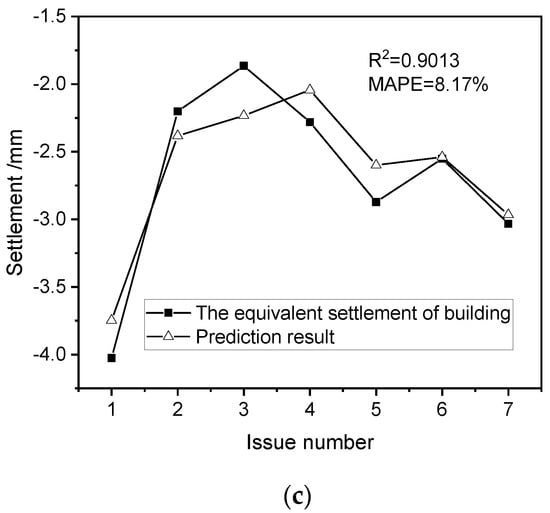 The settlement of buildings predicted by a machine-learning-based model; (a) SVM model; (b) BP model; (c) BP–SVM model.