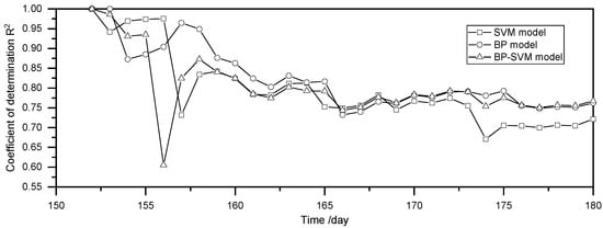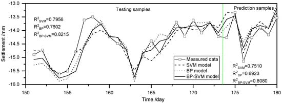 Figure 10 shows the prediction results for the settlement of buildings at JGY-22, using the SVM model, the BP model, and the BP–SVM model. It is found that the variation trends of the predicted results are consistent with the measured results, and the prediction accuracy of BP–SVM model is higher than that of the other two models. The prediction accuracy for the prediction samples is lower than that of the testing samples, but the values of R2 are all greater than 0.6 which is acceptable in the project. Figure 11 presents the history curve of R2, which indicates that the accuracy of prediction results decreases for long-term prediction with the advance of excavation, but it will gradually tend to stable.