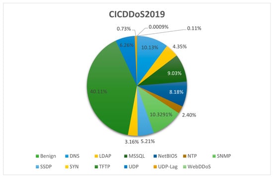 The percentage of traffic types of the CICDDoS2019 dataset.
