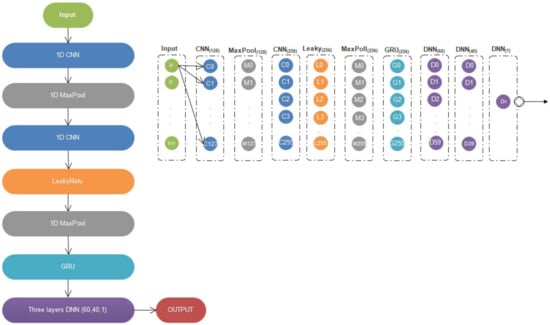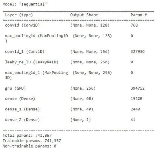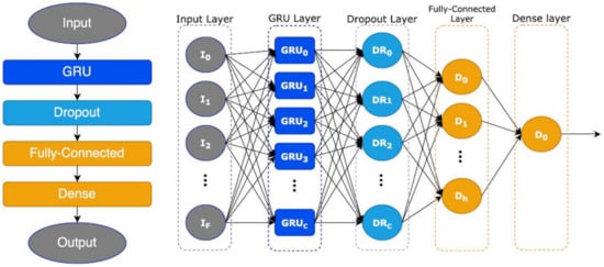 This work further identified the best-performing approaches and features the hybrid solutions to detect DDoS attacks in SDN. After running our proposed approach, we considered our results and compared our hybrid algorithm performance and GRU adopted by paper []. One reason to compare the performance of our approach with the gated recurrent unit (GRU) approach is that the GRU approach has already been shown to outperform state-of-the-art approaches in this context. Figure 6 illustrates a GRU approach diagram as the authors proposed it.