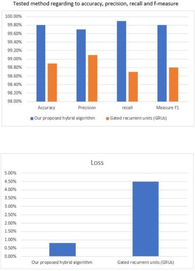 Our proposed hybrid algorithm was compared with the GRU algorithm using the evaluation metrics shown in Figure 8. The results indicate that the hybrid algorithm outperforms the GRU algorithm in all metrics, with a particularly significant difference in loss. The accuracy of the hybrid algorithm was 99.81%, while the GRU algorithm achieved an accuracy of 98.86%.