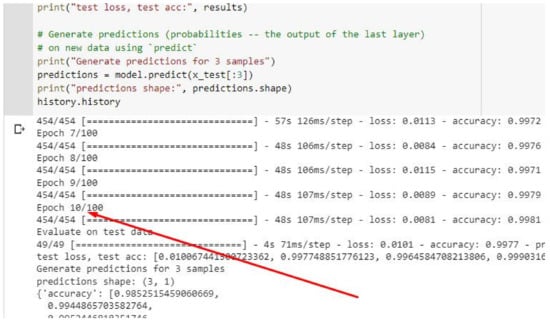 This exceptional efficiency is not uncommon in machine learning and deep learning algorithms, as we have observed in previous studies. Figure 10 illustrates the effectiveness of our algorithm in accomplishing the task with minimal computational resources, as evidenced by the red arrow which indicates the number of epochs employed in the experiment.