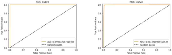 Figure 12 presents the receiver operating characteristic (ROC) curve for the CICDDoS2019 dataset, comparing the performance of our proposed method with the GRU method. Both approaches achieved good results, with our proposed method slightly outperforming the GRU method. Specifically, the area under the curve (AUC) for our proposed method was 0.9999, which is extremely close to the ideal value of 1, while the GRU method achieved an AUC of 0.9973. These results suggest that both methods are effective at distinguishing between normal and attack traffic, with our proposed method exhibiting a slight edge in terms of overall performance.