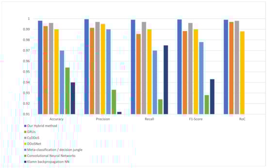 The model was trained and evaluated on the CICDDoS2019 dataset, which contains various types of DDoS attacks. The results obtained from the proposed hybrid model are shown in Table 3 and Figure 15, which show an accuracy of 0.9981, precision of 0.9996, recall of 0.999, and an F1 score of 0.9993. These results outperformed several existing models such as GRUs [], CyDDoS [], DDoSNet [], Meta-classification [], Convolutional Neural Networks [], and Klamn backpropagation NN []. The accuracy of the proposed model was higher than all other models, including those that used deep learning techniques. The comparison with the existing models showed that the proposed hybrid model achieved superior performance due to the combination of different deep learning techniques, which enabled the model to capture both spatial and temporal information of the data. The model’s ability to process data in multiple domains and its high sensitivity to anomalies allowed it to outperform the other models. The proposed model’s performance was also enhanced by the use of the CICDDoS2019 dataset, which contains a large number of samples and a wide variety of DDoS attacks.