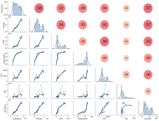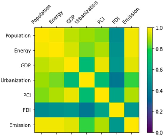 This research used emission data from the PRIMAP-hist dataset [53]. The PRIMAP-hist dataset combines several existing data sources for every country and Kyoto gas from 1750 to 2019, including all UNFCCC (United Nations Framework Convention on Climate Change) members and the vast majority of non-UNFCCC regions. The primary IPCC (Intergovernmental Panel on Climate Change) 2006 categories are resolved by the data. For CO2, CH4, and N2O, there are subsector statistics for energy, industrial processes, and agriculture. The PRIMAP-hist dataset compiles both country-reported and third-party data. However, in this paper, only country-reported data were used for Saudi Arabia. The PRIMAP-hist GHG emission dataset can be obtained from [53]. The population data were taken from the World Bank repository, where the country-wise population data are available from the year 1970 to 2021 [54]. However, since the GHG data are only available up to the year 2019, the population data up to the same year were used to calculate country-wise yearly per capita GHG emissions. In addition to population data, energy consumption, GDP, urbanization, per capita income (PCI), and foreign direct investment (FDI) were also collected and processed from the world bank repository [54]. To understand the trends in different data on Saudi Arabia, a scatter plot is provided in Figure 1. Most of the data show an upward trend from the year 1970 to 2021. In order to observe the correlation of different data, in Figure 2, a correlation matrix plot is provided. It is evident from the figure that GHG emissions are highly correlated with population, energy, and GDP and moderately correlated with other parameters.