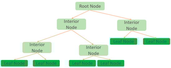 This study implements a supervised learning technique called a decision tree-based AI model to predict the GHG emissions in Saudi Arabia. Based on the binary tree concept, it divides several nodes into a decision tree. The dataset is divided into smaller classes using the decision tree algorithm, and the outcome is displayed as a leaf node [55]. The decision tree trains the dataset as a prediction tree structure. Therefore, it is sometimes referred to as tree structure classification/regression (Figure 3). The three nodes that make up DT are the root node, internal node, and leaf node. Initially, the root node is divided into other nodes, which are internal nodes. The leaf nodes represent the decision’s outcome, while the internal nodes reflect the model’s data properties and decision rules. The DT model can be defined as [52]: