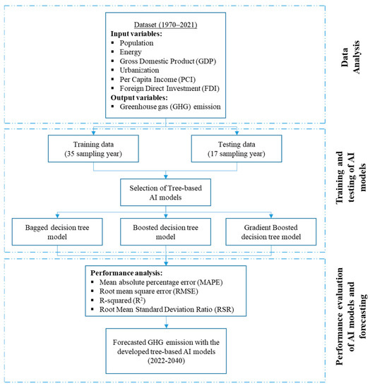 A number of studies have used a variety of machine-learning techniques to make projections about greenhouse gas emissions. Kalra et al. [24] used linear regression, DT, random forest (RF), and artificial neural networks (ANN) to model the correlation between global temperature and the atmospheric levels of nitrous oxide, methane, and carbon dioxide over 65 years. Based on the mean square error, the authors found that ANN was superior to the other algorithms. Three distinct ML algorithms were employed by Magazzino et al. [25] to study the correlation between solar and wind power generation, coal production, GDP per capita, and GHG emissions in China, the USA, and India. Based on the results of the ML simulations, it is clear that a complete transition from fossil to renewable energy sources is necessary to successfully reduce GHG emissions. Javanmard and Ghaderi [26] used data from 1990 to 2018 to train nine algorithms (ANN, AR, ARIMA, SARIMA, SARIMAX, RF, SVR, KNN, and LSTM) that forecasted GHG emissions in Iran to 2028. The authors found that an optimization model led to a 13–32% improvement in detection performance. To estimate carbon dioxide emissions from Group 20 countries, Mardini et al. [27] employed an adaptive neuro-fuzzy inference method and an ANN network to build multi-stage prediction models with clustered data. The growth of the economy and the use of energy were two factors taken into account by the authors. With regard to estimating future CO2 emissions, both the neuro-fuzzy inference system and the ANN network performed better than multiple linear regression.