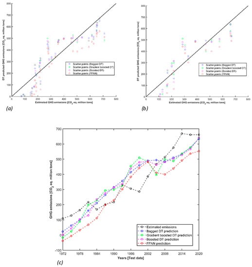 DT model output comparison: (a) Scatter plot for the training dataset; (b) scatter plot for the testing dataset; and (c) estimated vs. DT models predicted GHG emissions.