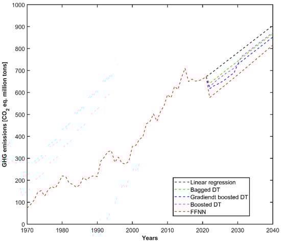 Predicted GHG emissions up to 2040 employing various decision tree models.