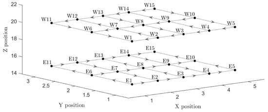 In this section, we suggest a route network-based urban airspace structure, which can be a potential candidate for the high-density VLL airspace structure. The proposed urban airspace structure concept resembles the airspace structure used in en-route phases of the ATM system today that can be considered as a combination of the Layers and Tubes concepts amongst four concepts Full Mix, Layers, Zones, and Tubes presented in []. The characteristics of the suggested airspace structure concept are as follows: consist of waypoints (nodes) and segments (edges) connecting some pair of waypoints; flight direction is strictly defined for all segments; at least two layers are stacked; separate traffic based on a time-based separation concept within each layer. As shown in Figure 1, for example, there is an eastbound layer and a westbound layer, and each layer consists of parallel-aligned northbound segments and southbound segments. Such a route network over roads with directions in urban airspace will increase the predictability of traffic by using flight plans. In this concept, the urban airspace structure can be thought of as a directed graph (or digraph) , called an airspace graph to highlight the aerospace context. In the airspace graph , node  is a point in Euclidean space of dimension two or three representing a waypoint candidate to be traversed. Edge , corresponding to a rectifiable curve, is a segment between some pair of waypoints in the airspace graph .