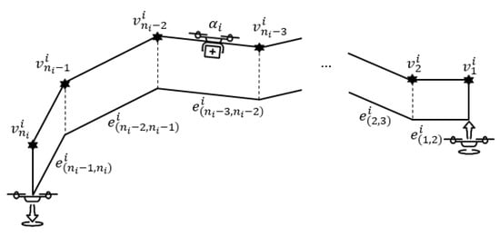 where  is the number of waypoints sUAS  traverses as shown in Figure 2. For each sUAS’ flight route as given in above equation, there is a set of segments connecting the waypoints, which is as follows: