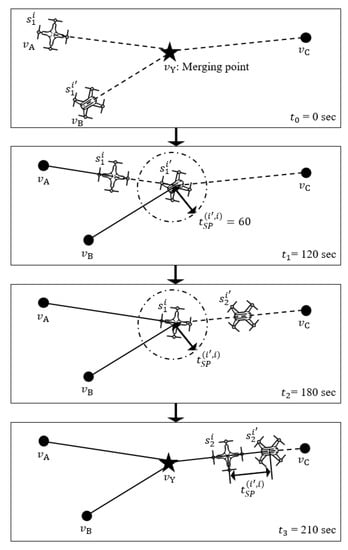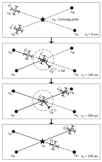 The separation concept allows time-based separation to be satisfied at merging points and crossing points as shown in Figure 3 and Figure 4, respectively. At the time  of Figure 3, sUAS  and sUAS  fly towards the  through the same merging point  at speeds  and , respectively. The time  is stored at each start point  and , and no sUAS can pass through both of the waypoints for separation time  seconds and  seconds before and after , respectively. Note that, where  is dependent on the types of  and . The time  of Figure 3, when  just passes through , is stored at the merging point , and no sUAS can pass through this waypoint for  seconds before or after . The time  of Figure 3 is stored in  in the same way. Then,  and  traverse towards  at speeds of  and , respectively. If  and  fly from  to  at speeds of  and , respectively, the separation between the two sUASs will always meet the separation requirement or be greater than that on the segment between  and . At the time  of Figure 3,  and  fly at the same speed while maintaining the minimum separation. The flight schedule from  to  at each waypoint is as follows: