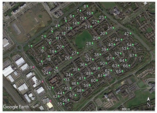 Oldbrook, Milton Keynes, United Kingdom (from Google Earth Pro). Green pins (1∼67) and red pins (67∼70) represents retail points and service points respectively.