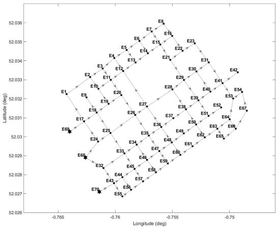 In the -to- operation type, each sUAS traverses with an item from the predetermined retail points (E68, E69, and E70) to the each sUAS’ predetermined service point from E1 to E67 in Figure 8. It is assumed that each retail point has five second departure intervals.