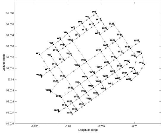 In the -to- operation type, each sUAS traverses with an item from each sUAS’ predetermined service point between W1∼W67 to the predetermined retail points (W68, W69, W70) in Figure 9. We assume that all sUASs depart from each sUAS’ service points at the same time to consider the worst case scenario.