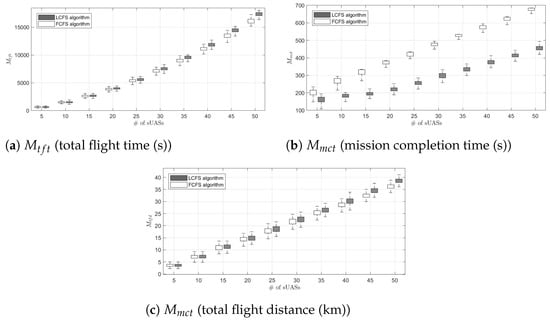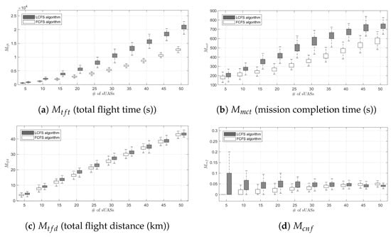 The metric, , is the cause of increasing  and . Namely,  and , which also indicate sUASs’ performance, are directly related to . Mission completion time, , is an indicator of the performance of the urban airspace within a given period of time, although its relationship with  and  is not prominent. From the results, the following analysis can be made: (1) For the four operation types, the FCFS algorithm generates more efficient results than the LCFS algorithm for  and . This is because sUASs with short flight times complete the flight first, and then the other sUASs can fly in relaxed urban airspace at high speed; (2) for the 1-to- operation type, the LCFS algorithm shows very efficient results for . This indicates that the LCFS algorithm efficiently uses the urban airspace for a given time period; and (3) from the standard deviation of the results except for the 1-to- operation type, the FCFS algorithm is easier to predict each metric as the number of sUASs increases than the LCFS algorithm. The main reason why the standard deviation of the LCFS algorithm results are high is that the variation of each sUAS’ speed profile dependent on the randomly selected starting point and destination point is very large.