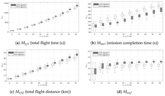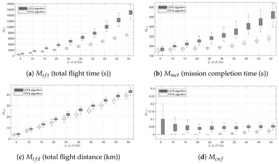 Figure 11c shows that  of the LCFS algorithm is slightly higher than the FCFS algorithm, and Figure 11a shows that  is rapidly raised as the number of sUASs increases compared to . As a result, it is seen that the LCFS algorithm causes not only detours but also low flight speeds. These results are inextricably linked to  shown in Figure 11d, resulting in inefficient and unpredictable results for . In all respects, therefore, the FCFS algorithm is better than the LCFS algorithm for the -to-1 operation type for the urban airspace.
