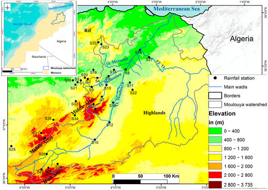 The Moulouya watershed, which covers almost the entire eastern administrative region of the country, is a good example of an arid area heavily occupied by agricultural activities [32], as it is very vulnerable to the adverse effects of drought and characterized by high demand for water resources [33,34]. For this reason, we focused in this work on the impact of climate change on rainfall variability in this basin.