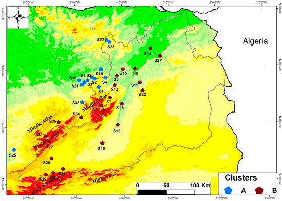 Schematically, the two clusters are separated by the Middle Atlas Mountains. The first group of stations is located in the western part of these mountains (Figure 6). It therefore receives atmospheric disturbances coming from the north or from the wadi of the country. These disturbances are responsible for most of the winter precipitation that Morocco records. The second group is located on the eastern part of the Middle Atlas summits (Figure 6). It covers the arid zone of the Moulouya and is thereby sheltered from the atmospheric disturbances mentioned previously.